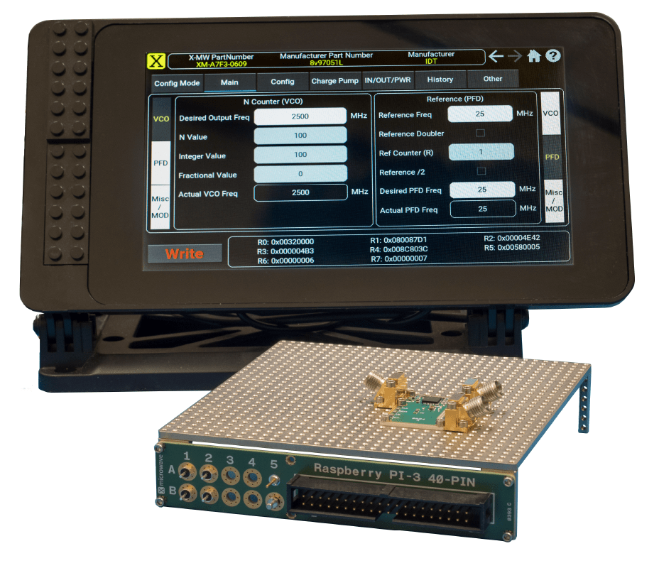 The X-MWcontroller provides network-based control and local touchscreen configuration for supported SPI and parallel-controlled devices. Designed for bench-top development, it enables rapid setup and repeatable configuration of PLLs, digital step attenuators, and other programmable components, without requiring custom software installation.